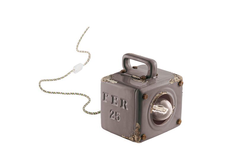 The Industrial 155mm Table Lamp in Vintage Dove Grey by Ferroluce features a compact design with a distressed finish.