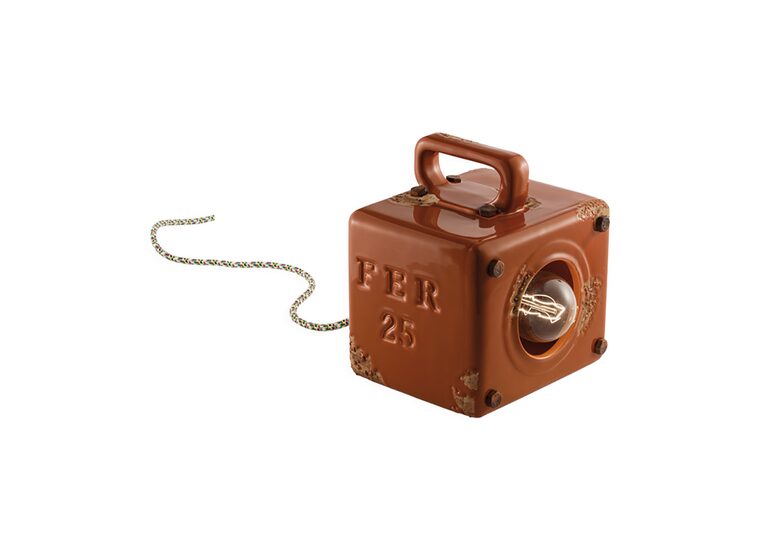 The Industrial 155mm Table Lamp in Vintage Orange by Ferroluce features a compact design with a distressed finish.