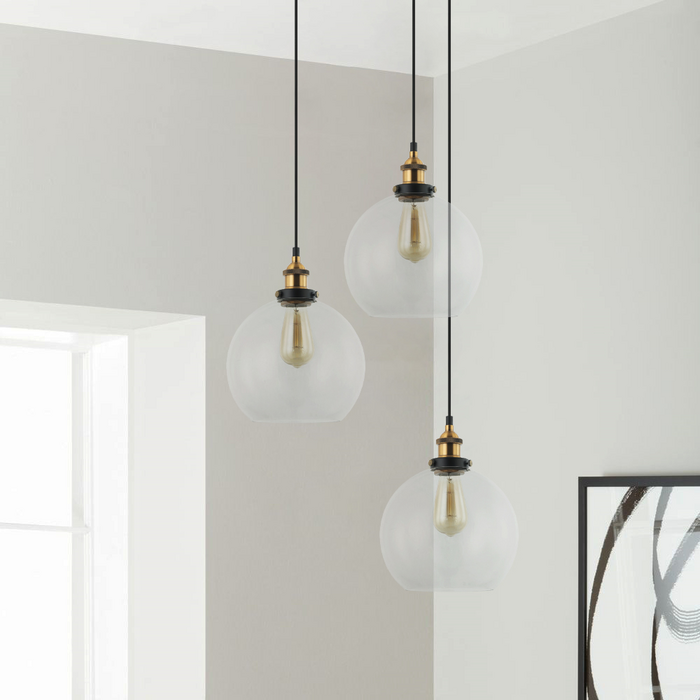 Available in a Clear, Black Smoke or Amber glass option, with extended antique brass hightlight suspension metalware.