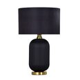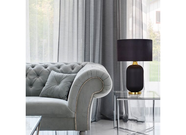 Up top is a shade with gold metallic trim for a final touch of drama. Available in black.