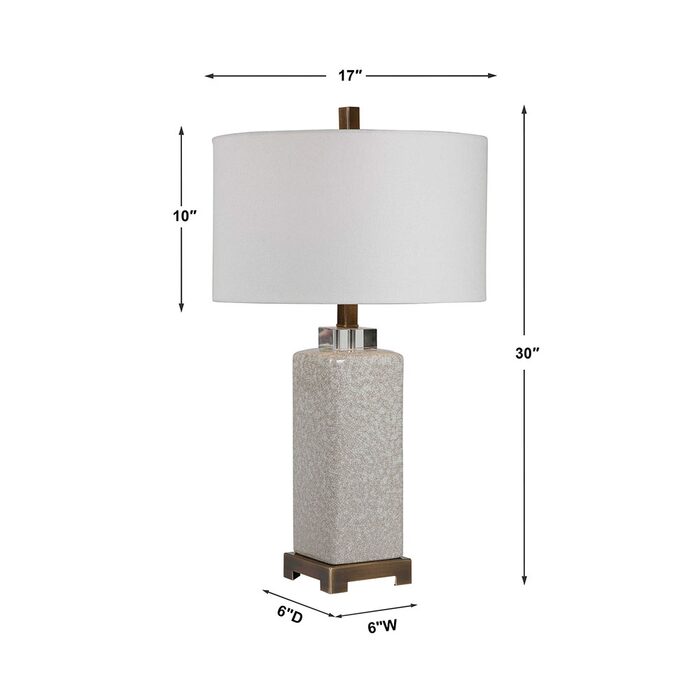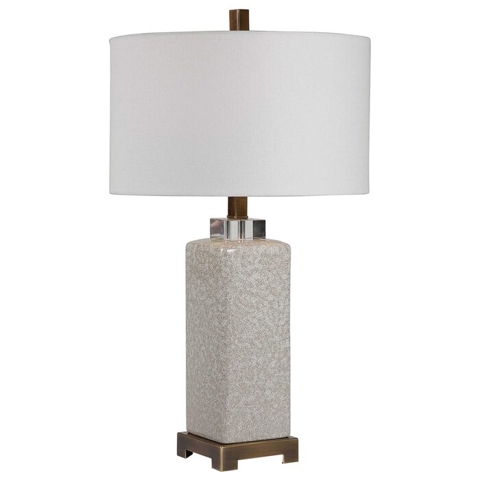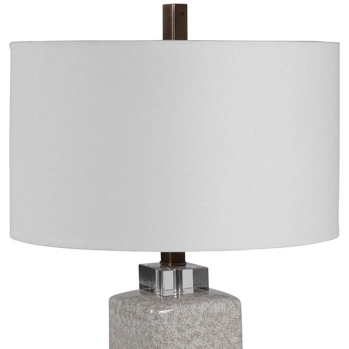 Ceramic table lamp features a cream and taupe crackle glaze with antique brushed brass plated details and crystal accents.
