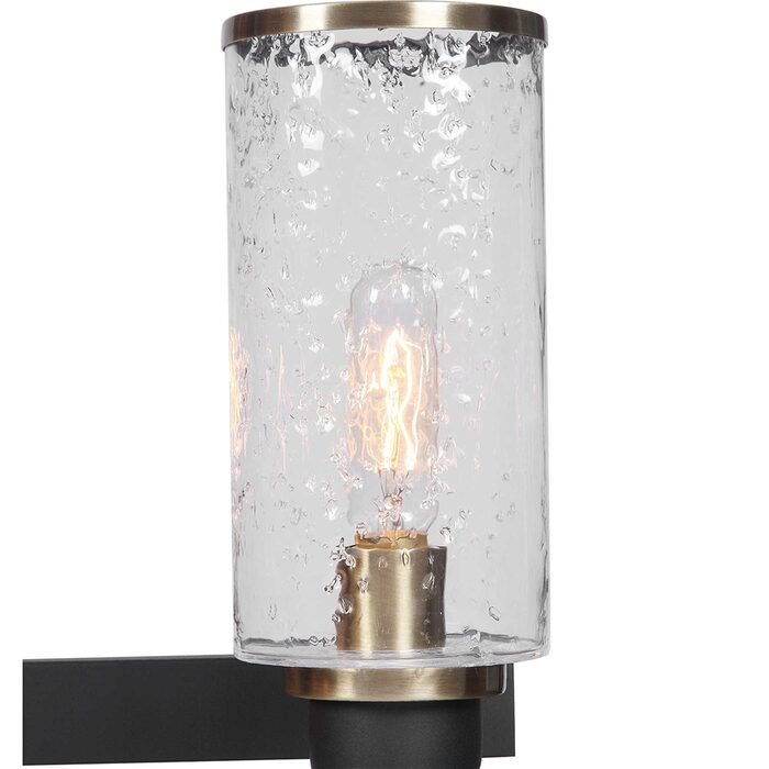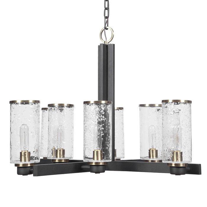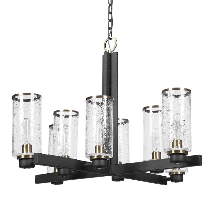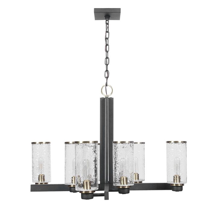 Refined industrial with clean lines on our 8 Lt. chandelier feature a sanded black finish on the I-beam style frame with refined antique brass accents and clear meteor shower glass shades. With 8-60 watt max Edison sockets.