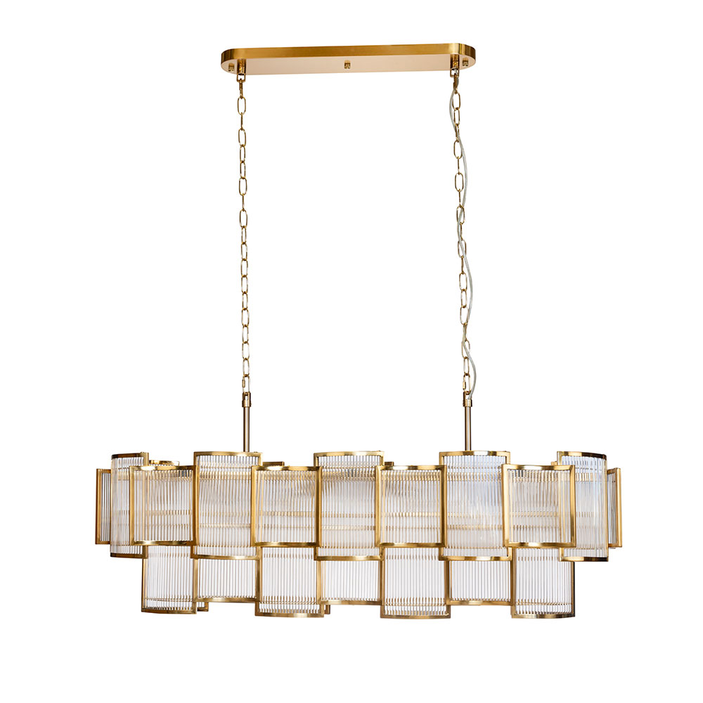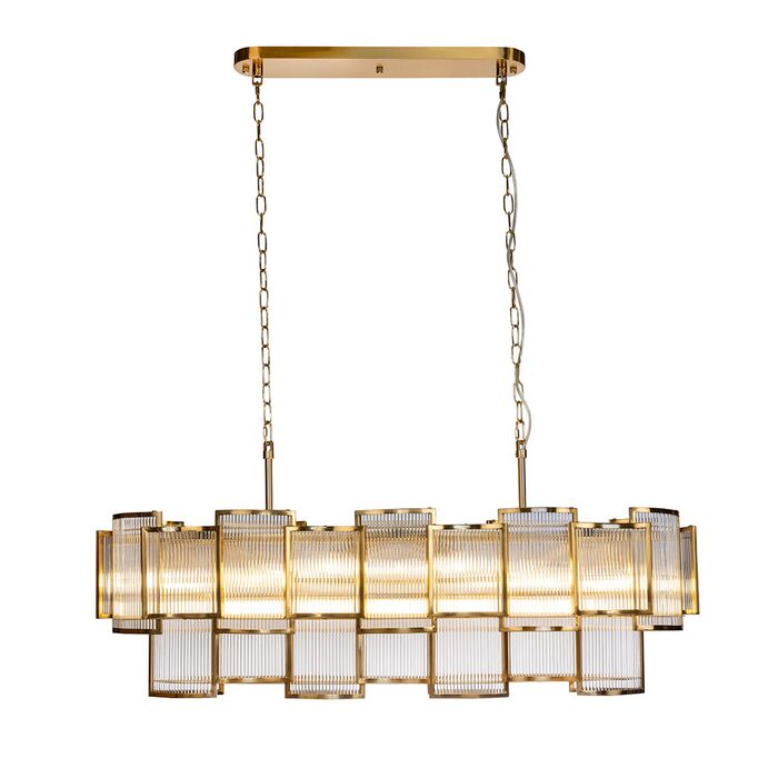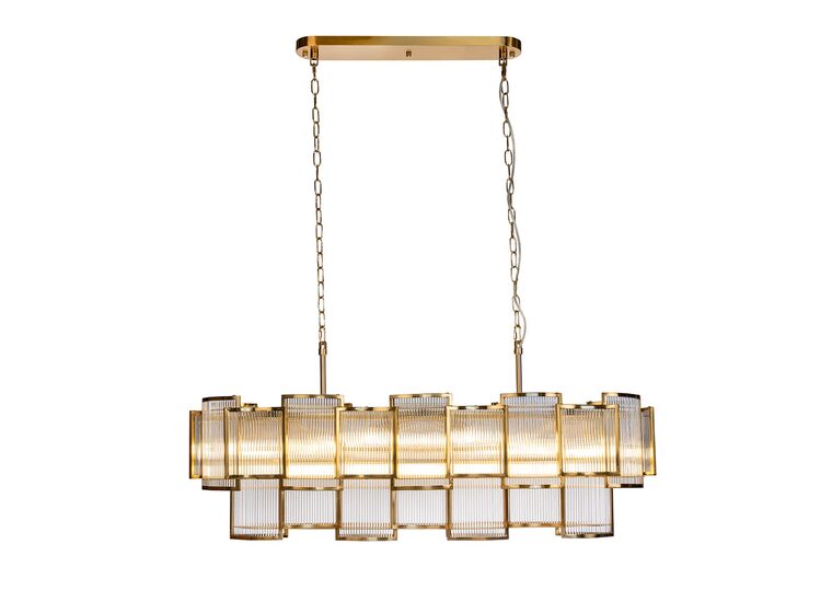 The Jasina chandelier features brushed brass finished metalwork, enclosing clear glass rods to create a timeless look suitable for contemporary and traditional interior schemes.