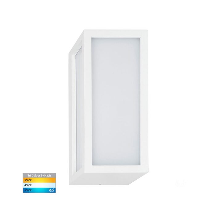 The HV3669T-WHT is the Havit Jasper White LED Wall Light, a modern, durable outdoor fixture made from poly powder-coated aluminum with a polycarbonate diffuser.