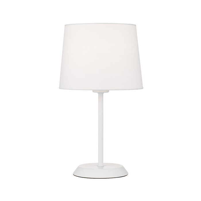 The Jaxon table lamp is a contemporary tapered fabric shade a top of simple metal base.
