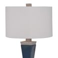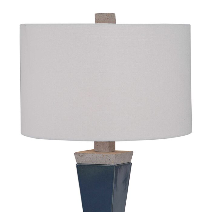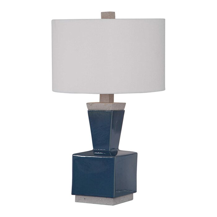 Modern and industrial styles merge in this minimalist table lamp design. A rich, deep blue glaze finishes the geometric base and is paired with gray concrete accents.