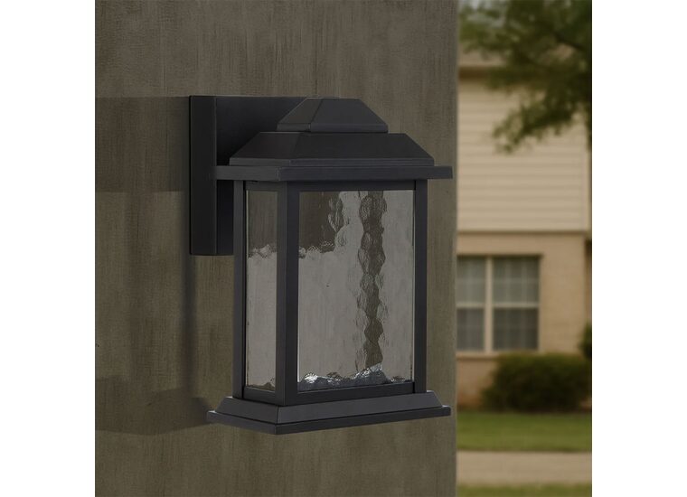 The Jovaro exterior wall light features a sleek black sand finish paired with beautifully textured water-glass panels that create a soft, inviting glow.