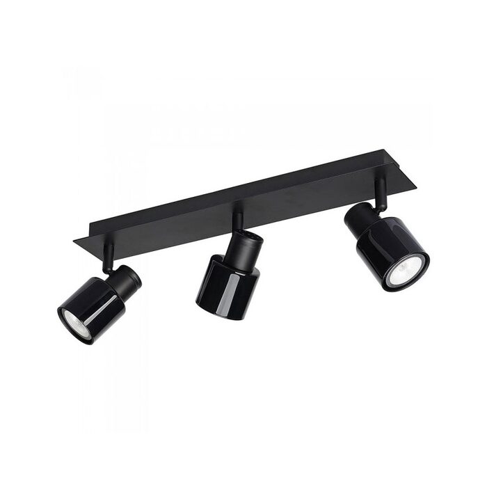 A modern, stylish GU10 Triple Bar Spotlight. It has a sleek black metal body with a glass shades.