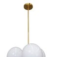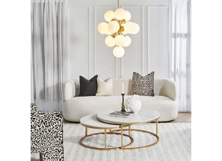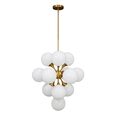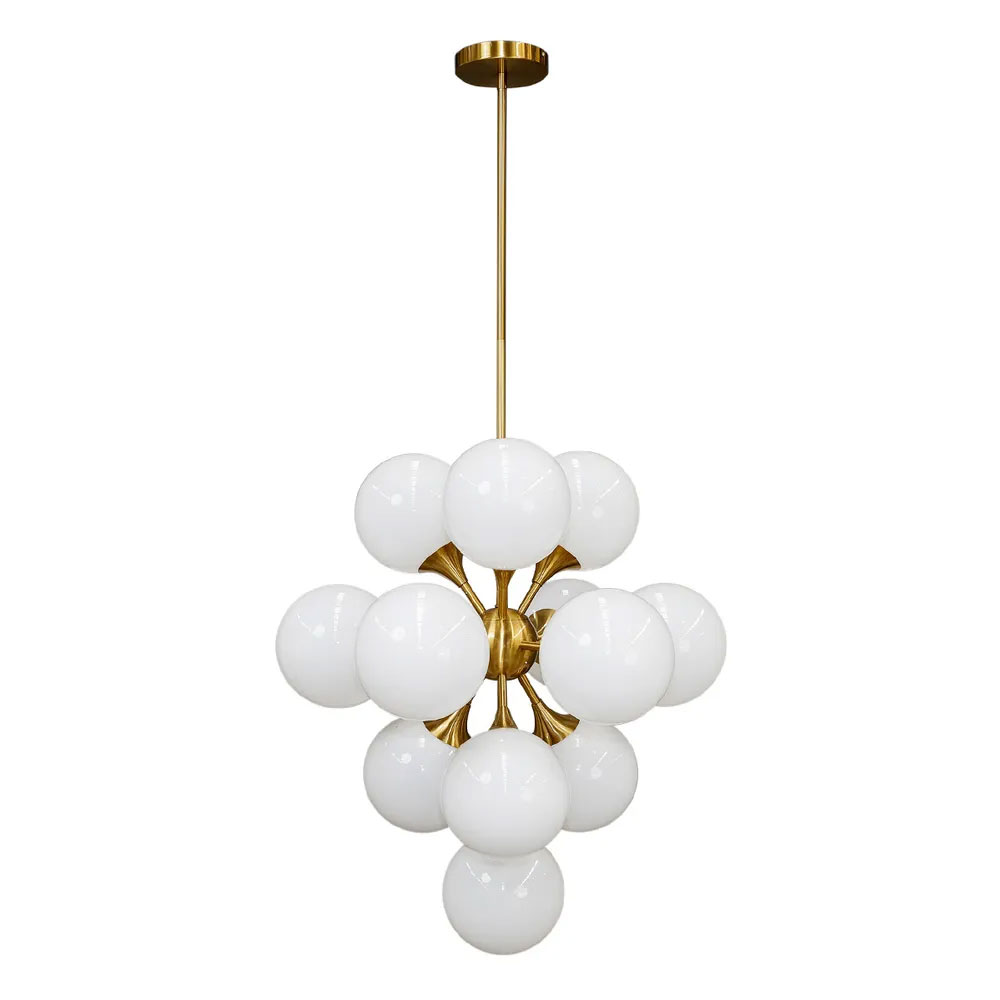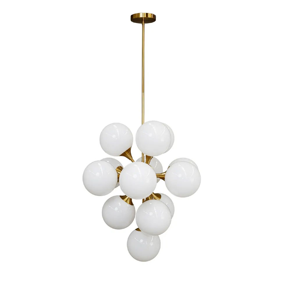 Featuring a series of 13 opal glass orbs, each meticulously arranged in a dynamic cluster formation, it creates a captivating visual centerpiece.