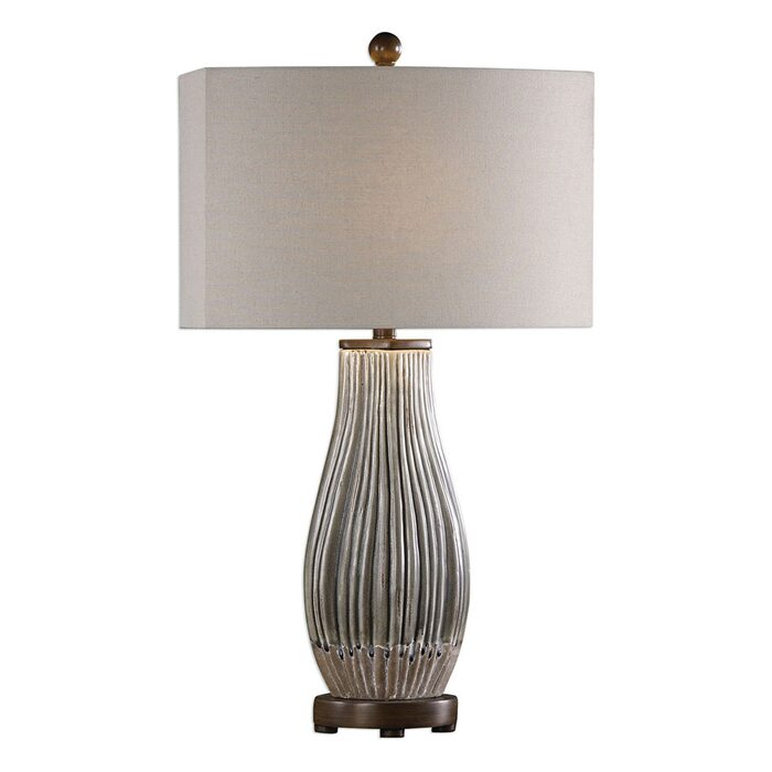 Ribbed Ceramic Base Finished In A Crackled, Mushroom Gray, Dripped Glaze Accented With Rustic Bronze Details.