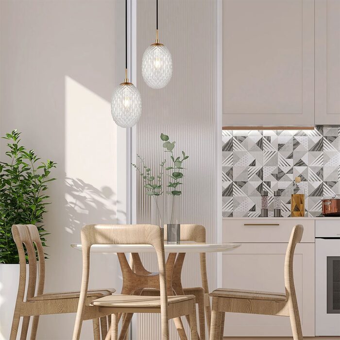 A long and thin wire drops down from the ceiling and leads to a gleaming rod finial and the ellipse glass segmented with brass highlight enclosed pendant light.