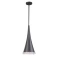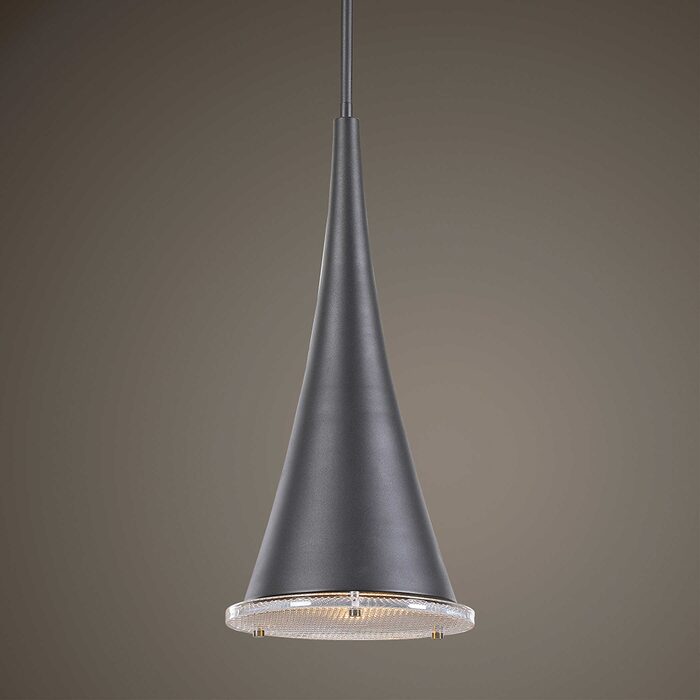 Dramatic elongated cone 1 Lt. Pendant in a sand textured black finish enhanced with a thick prismatic glass lower diffuser. 1-60 watt max, Edison socket.