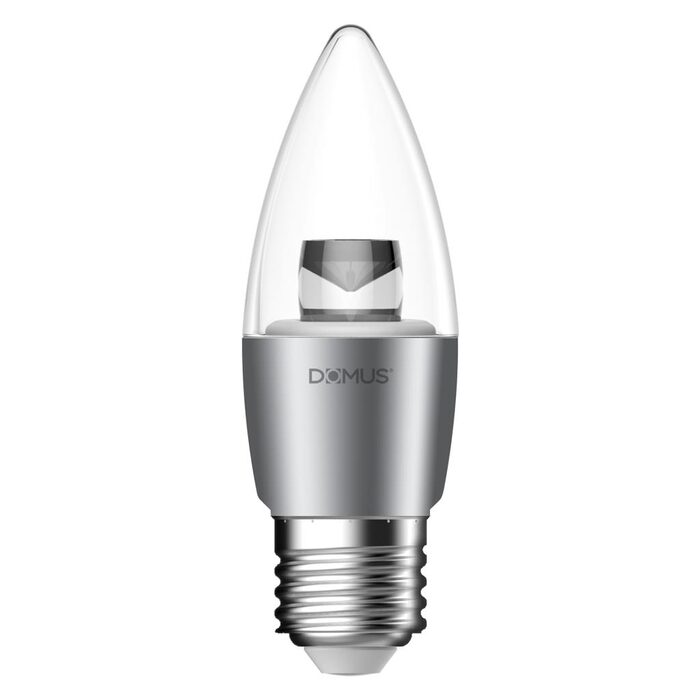 6W mini household globe, candle shape. E27 base - Clear diffuser. Chrome body.