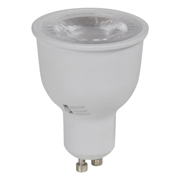 6W 240V globe, GU10 shape, with a 60° wide beam for better light projection. Tricolour switchable: choose between Warm White (3000K), Neutral White (4000K), or White (6500K) colour temperatures with the flick of a dip switch.