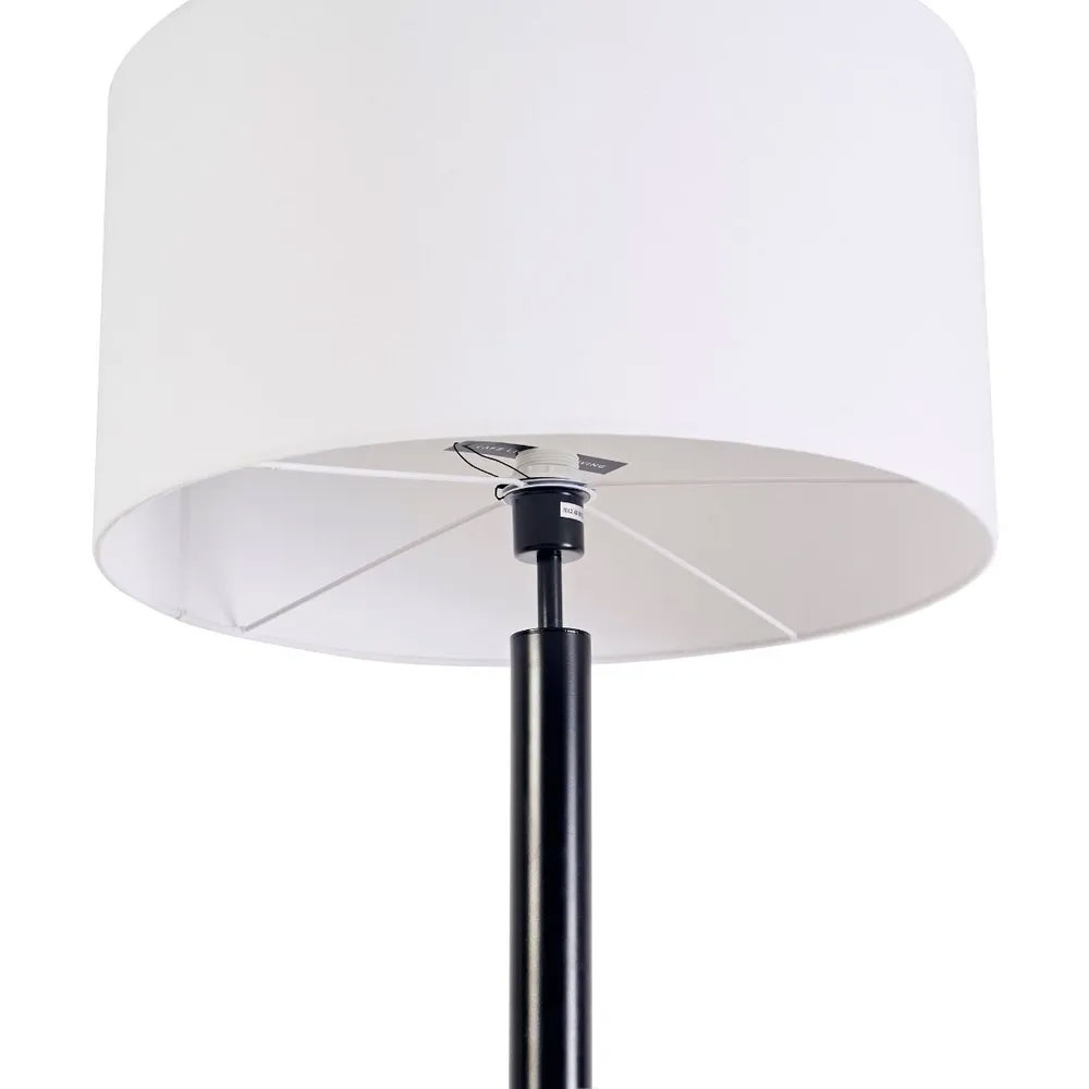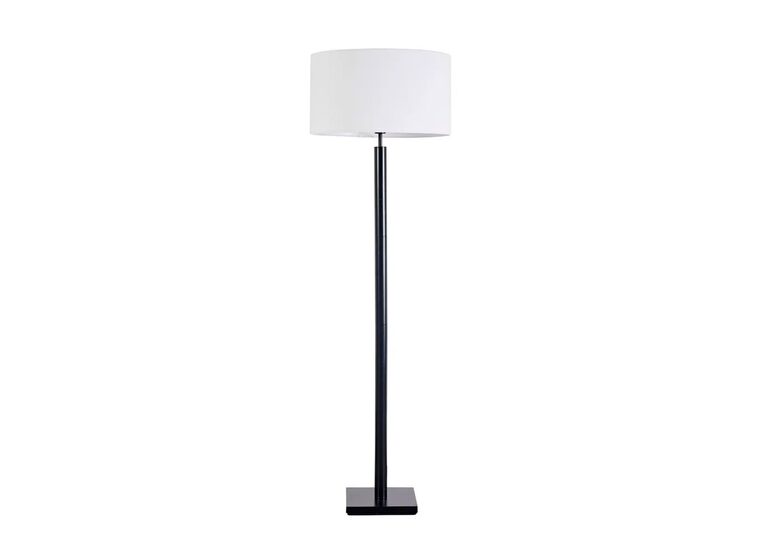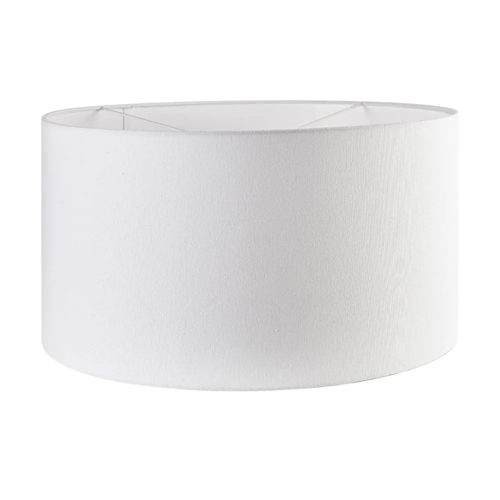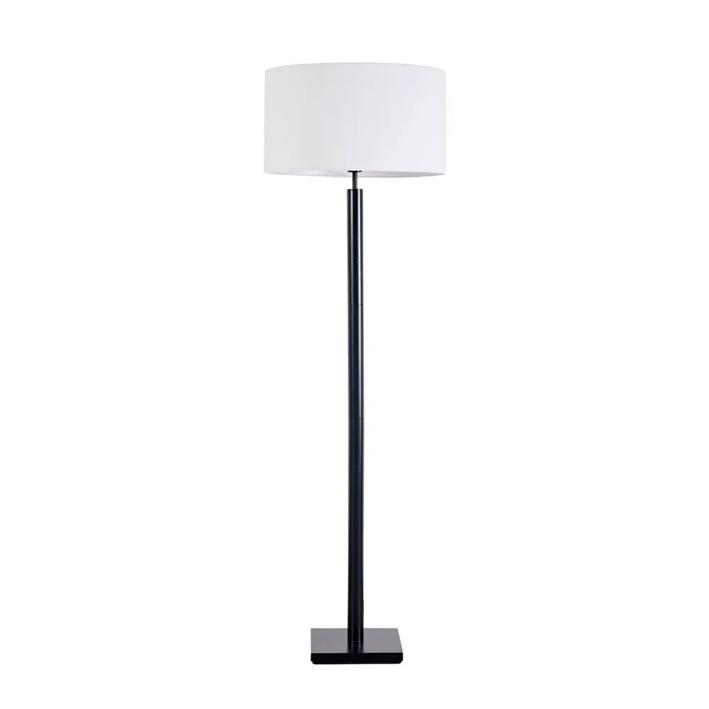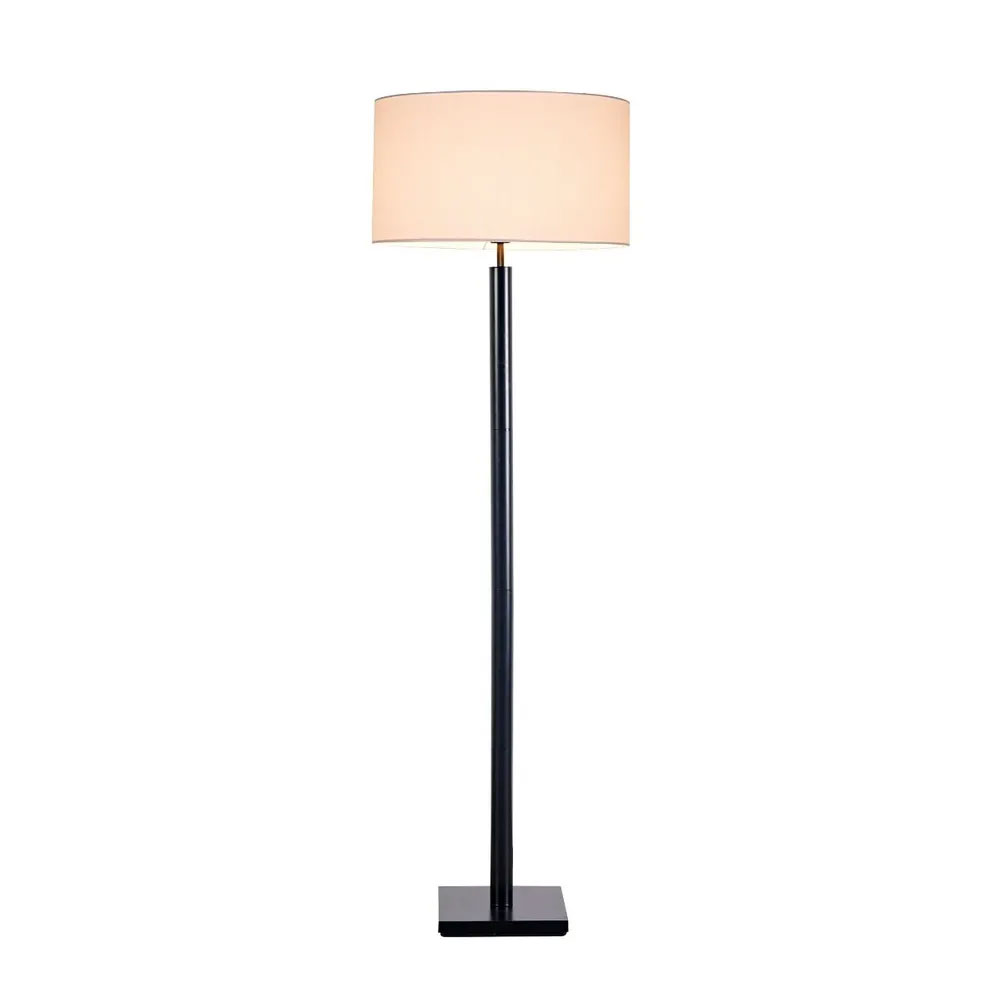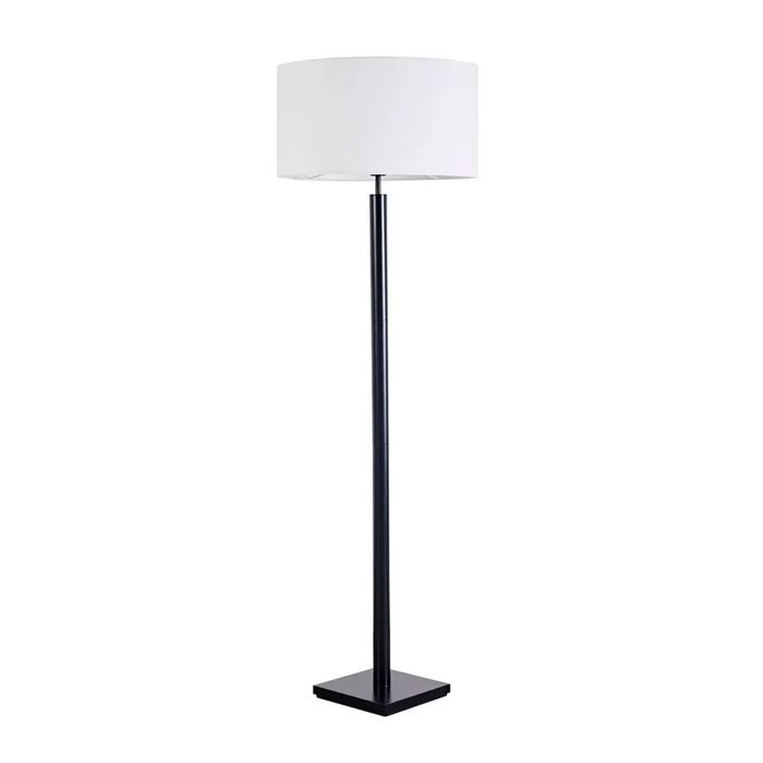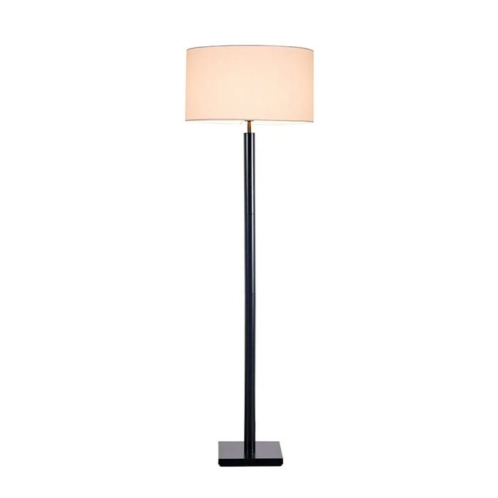 Featuring a tall cylindrical metal pole and a wide off-white drum shade, it offers soft, ambient illumination ideal for living rooms, bedrooms, or reading spaces.