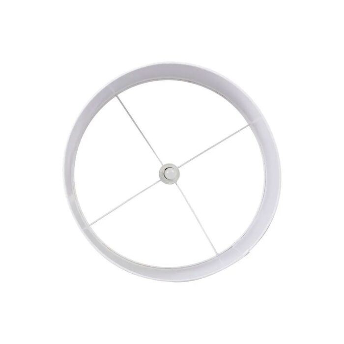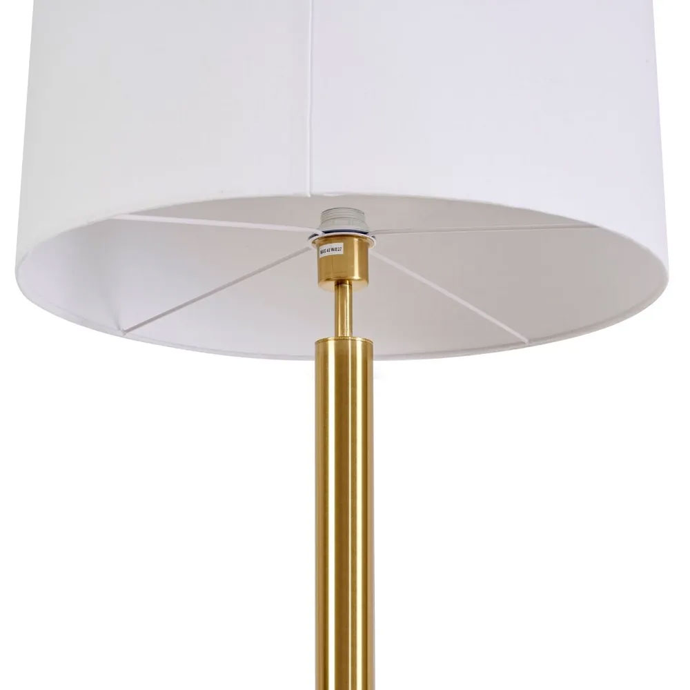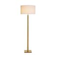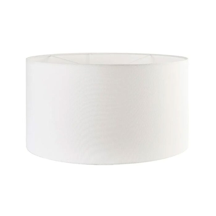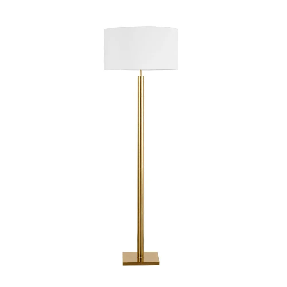Featuring a tall cylindrical metal pole and a wide off-white drum shade, it offers soft, ambient illumination ideal for living rooms, bedrooms, or reading spaces.