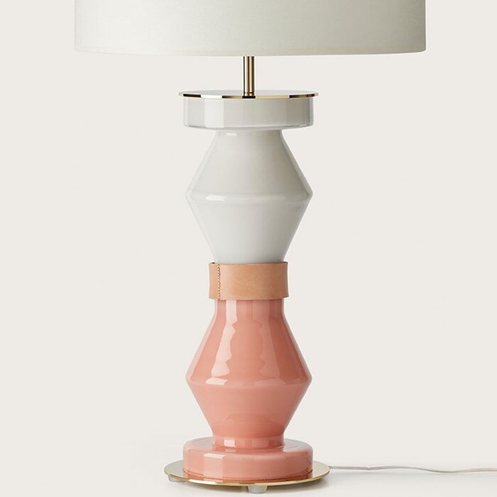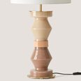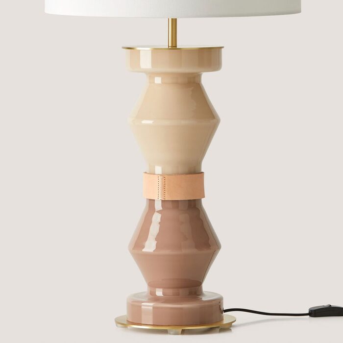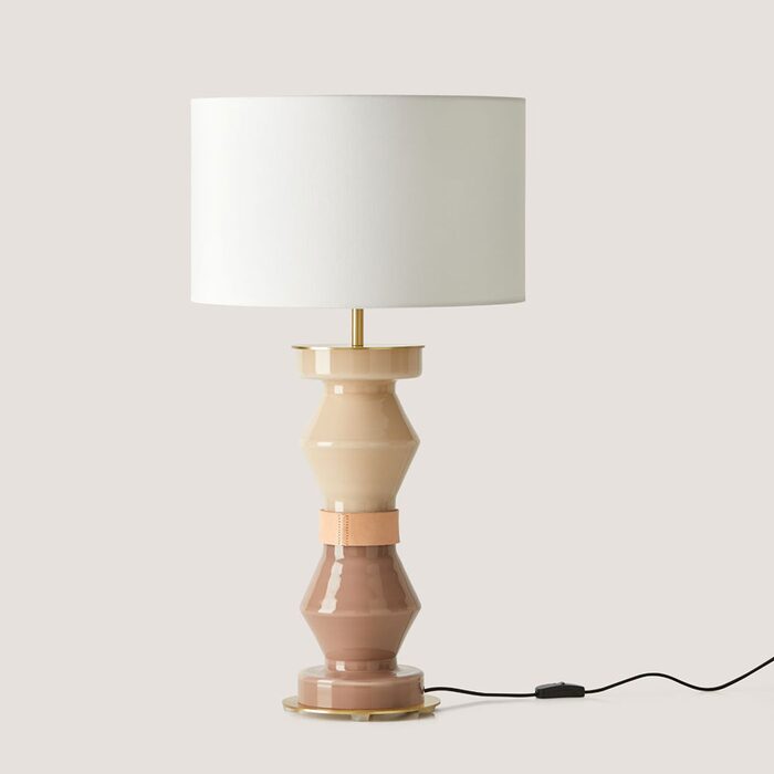 Kitta Kitta is a tall table lamp with a vibrantly coloured glass base that prominently features a composition of mixed forms.