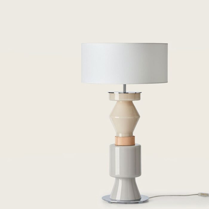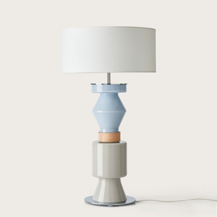 Kitta Ponn is a tall table lamp with a vibrantly coloured glass base that prominently features a composition of mixed forms.
