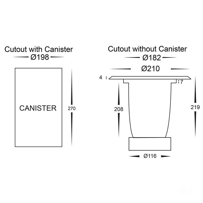 - Cut-out Size Diameter: 182mm (Without Canister)