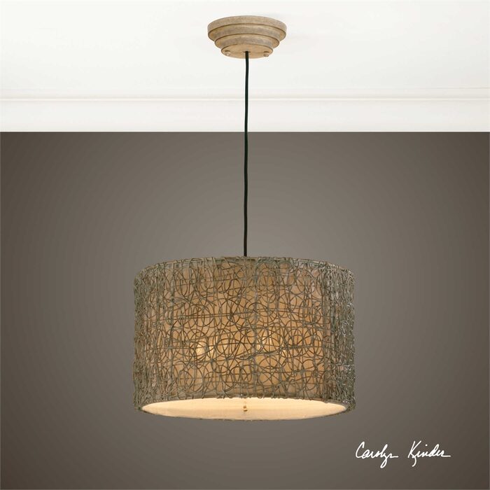 Hand rubbed ivory finish with brown dry brushing and a gray glaze and a frosted glass diffuser.