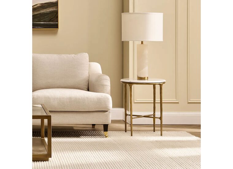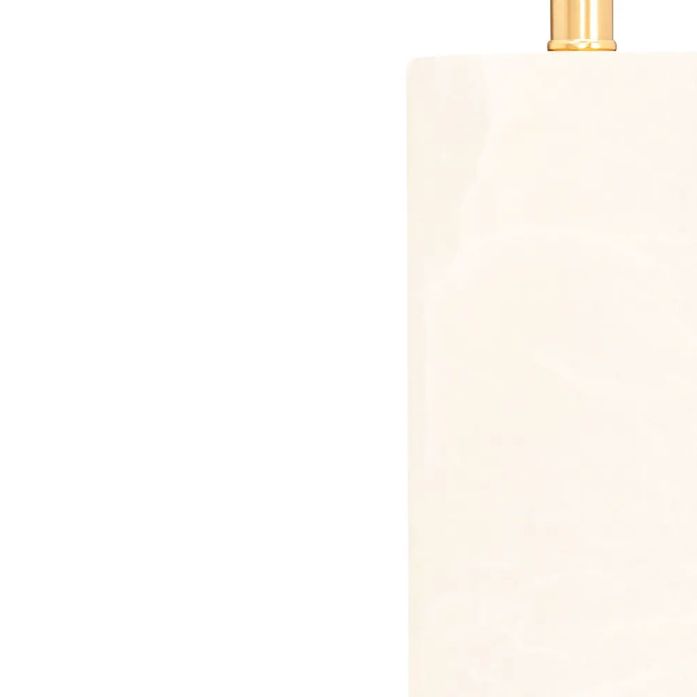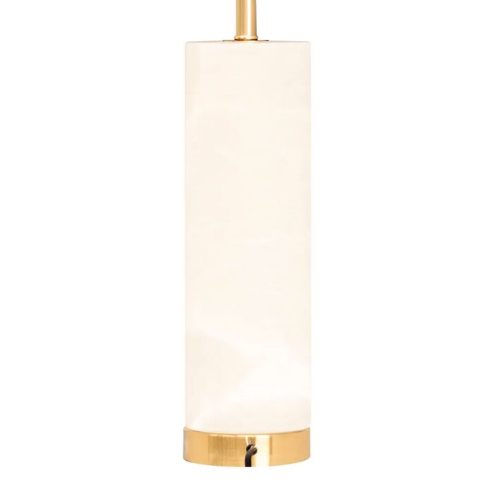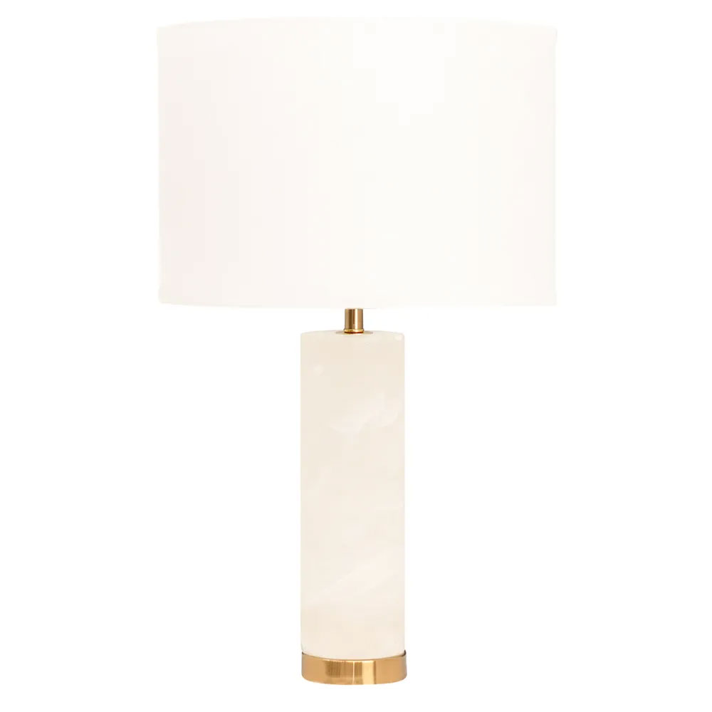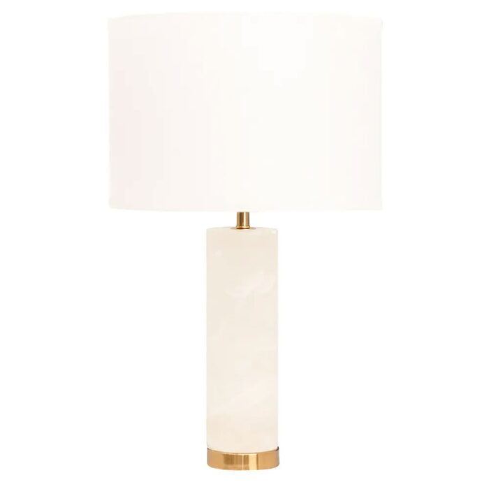 Unpretentious luxury and slender in design, the Kolari Table Lamp features a divine alabaster and brass-finished cylindrical base topped with a fresh faux off-white linen drum shade.