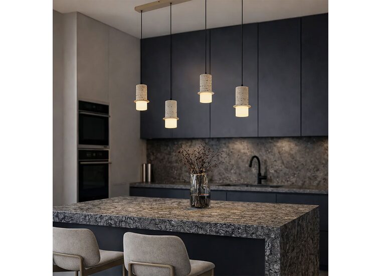 Together, the pendants and table lamps create a cohesive, natural aesthetic that blends contemporary design with organic materiality.