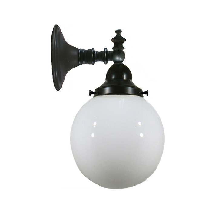 Traditional patina wall light with an upward facing 6" opal glass.