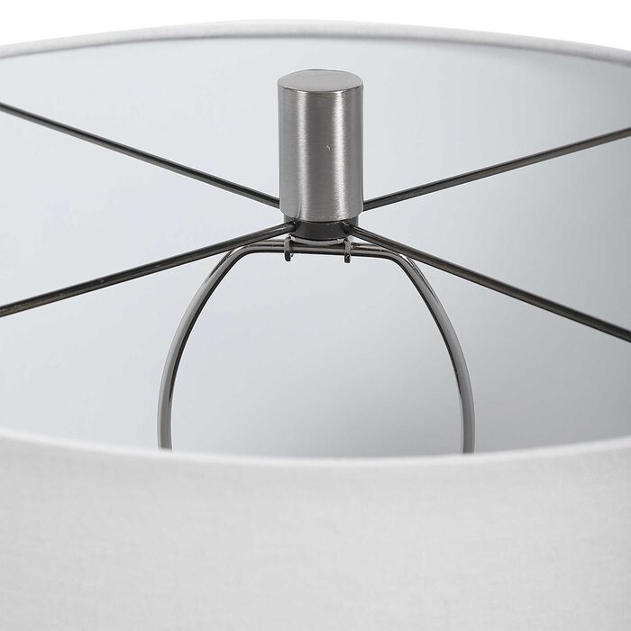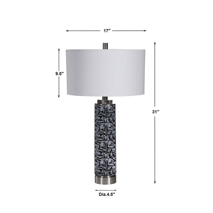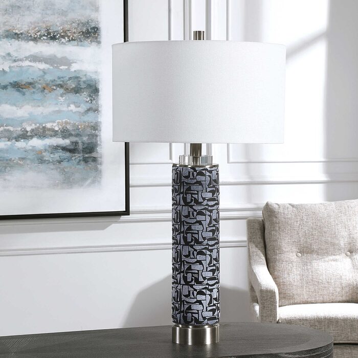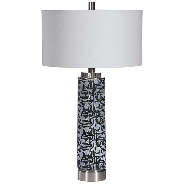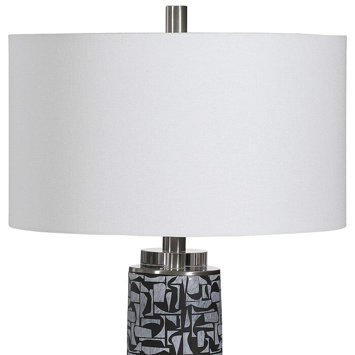 Displaying roots in Scandinavian style, this table lamp showcases a unique smoked gray glass base with charcoal flecks accented by a matte black etched inlay.