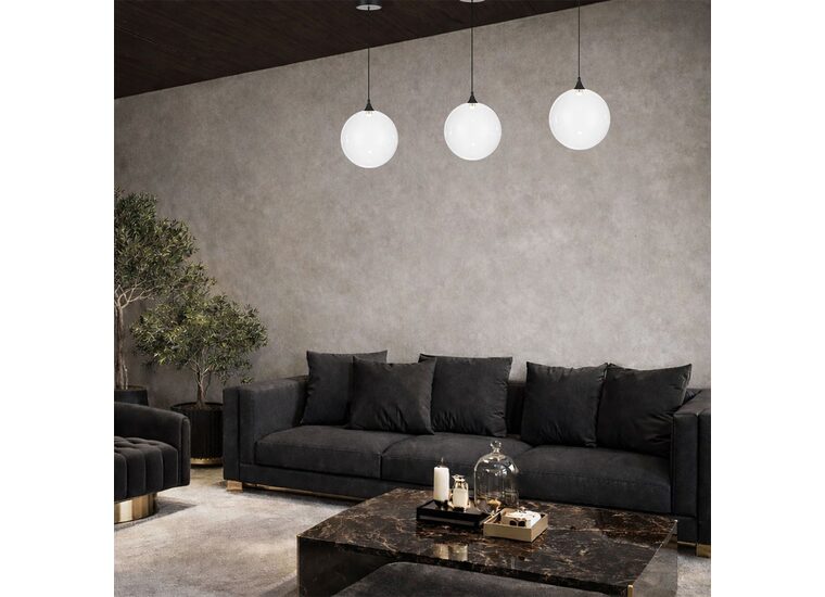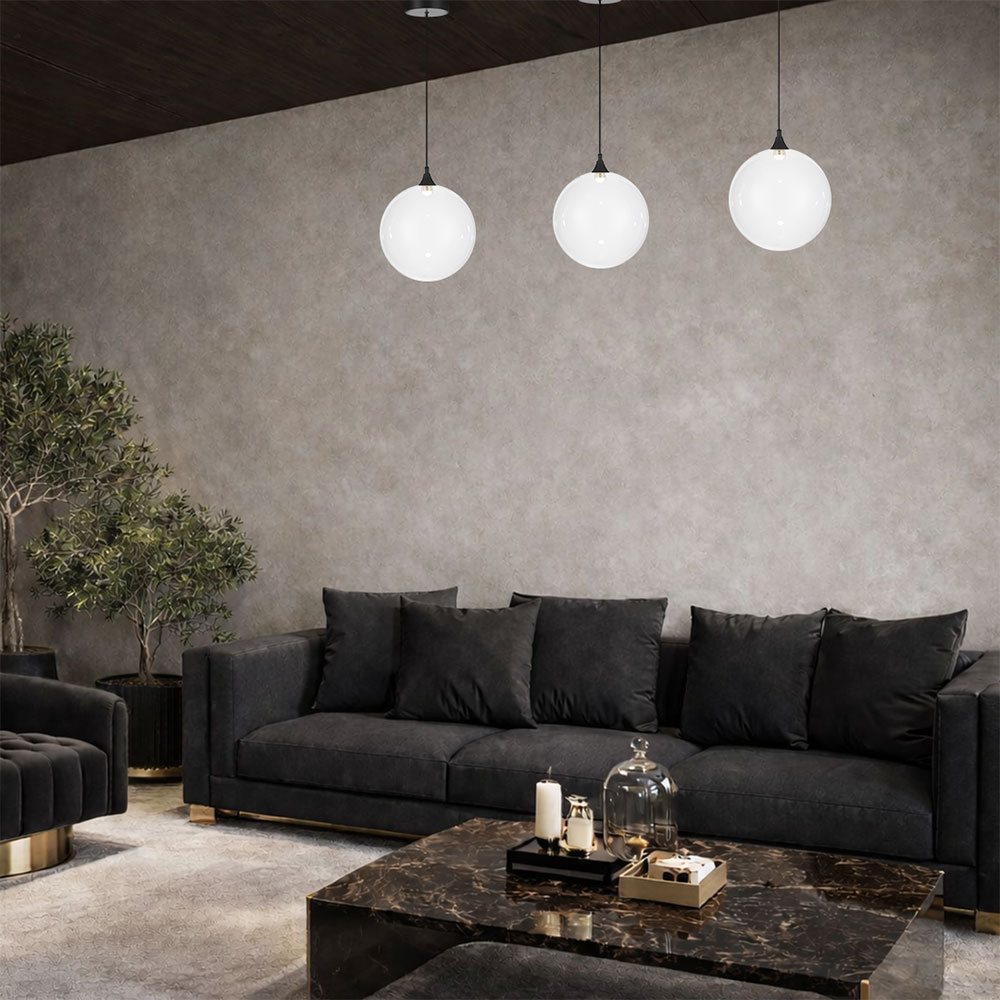 The Kupla pendant offers a contemporary statement with softly rounded glass forms, delivering a refined yet playful aesthetic.