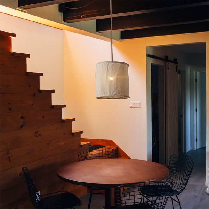 The Kya pendant and wall light offer soft ambient lighting, utilising natural linen lampshades, perfect for smooth light tones in relaxing spaces like loungerooms and sitting areas.