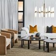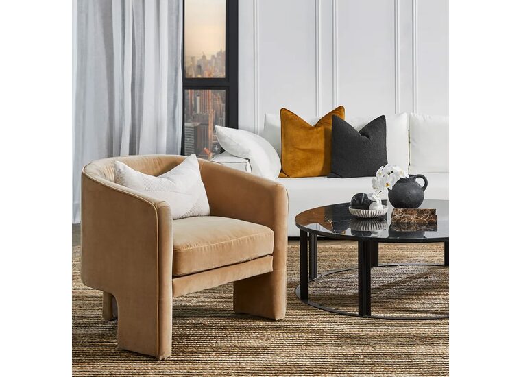 Our popular Kylie armchair infuses interiors with undeniable style, completely wrapped in a luxurious, soft-to-touch ochre velvet upholstery.