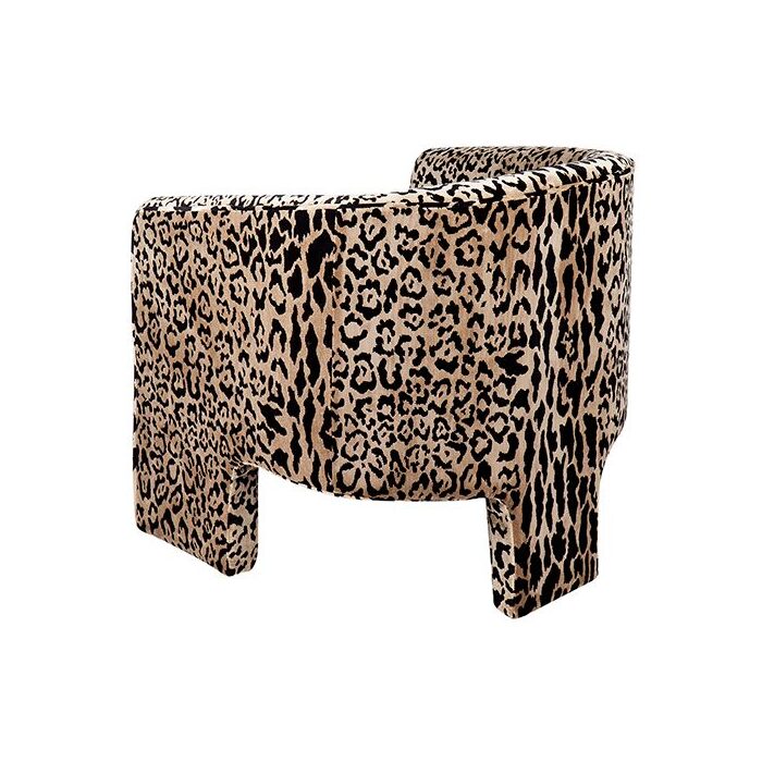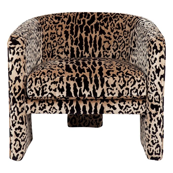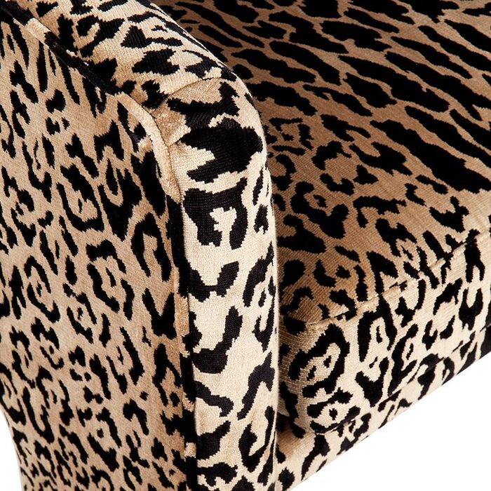 Leopard chenille upholstered occasional arm chair, curve style with tripod fully upholstered legs with detailed piping around the sides and back of the chair.