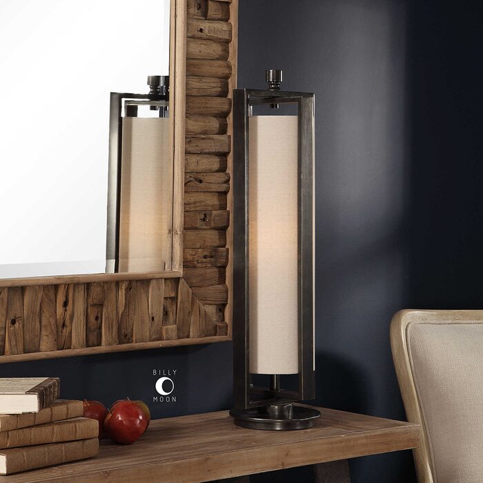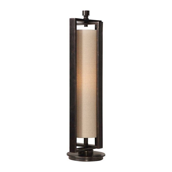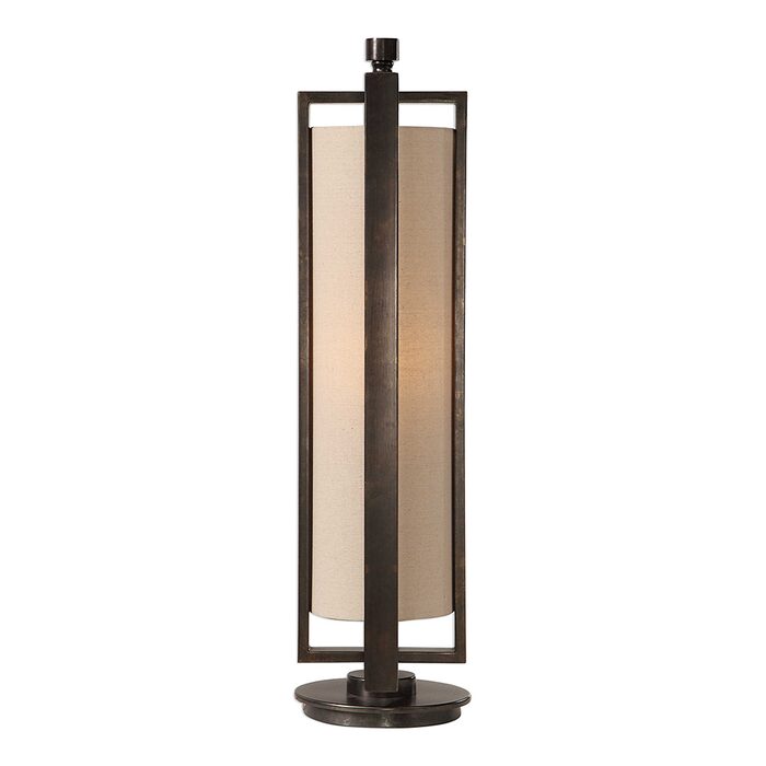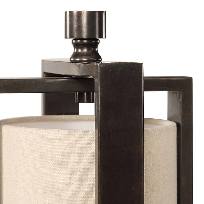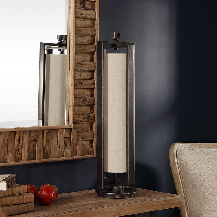 A contemporary, open-framed design is showcased in this thick iron accent lamp finished in an aged gun metal black for a subtle industrial flair.