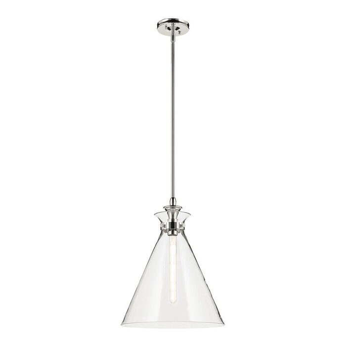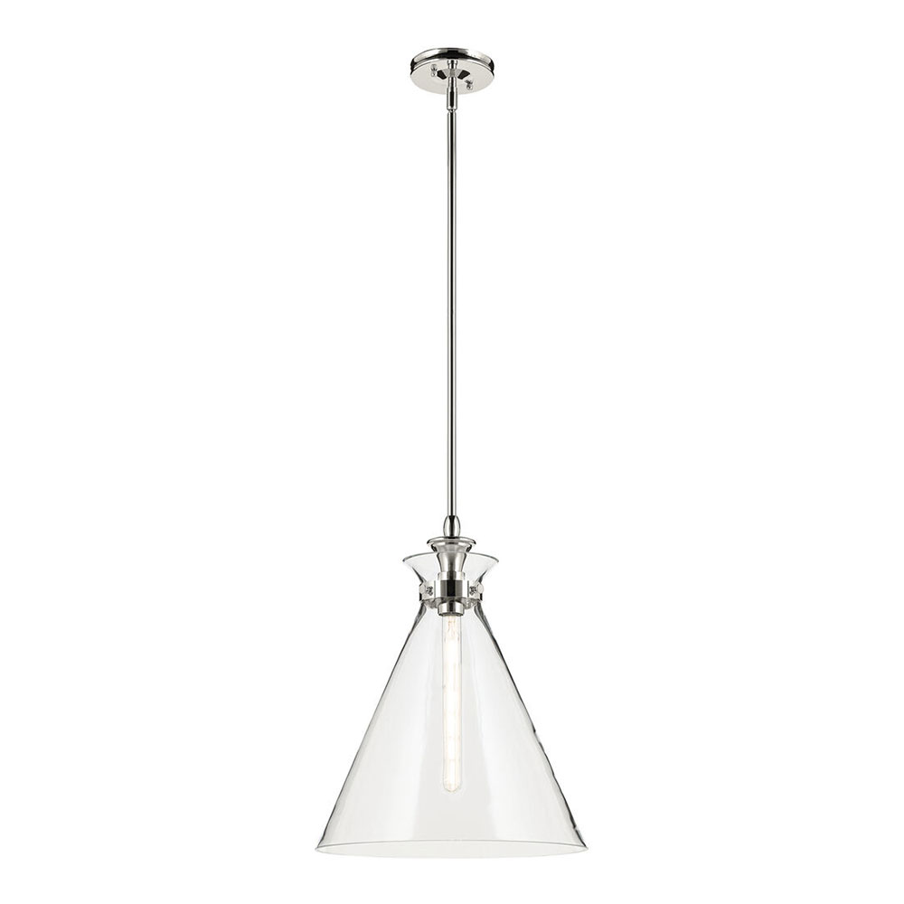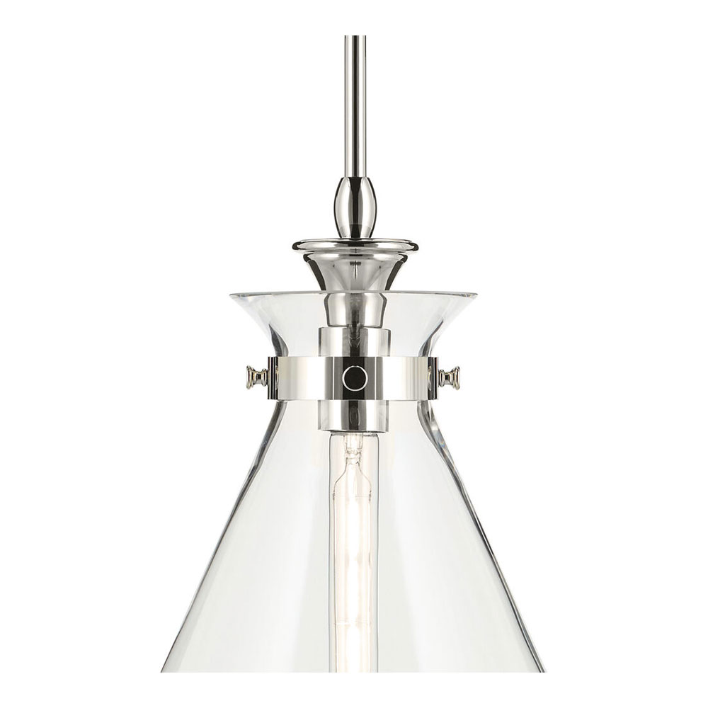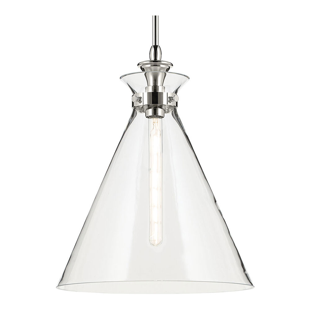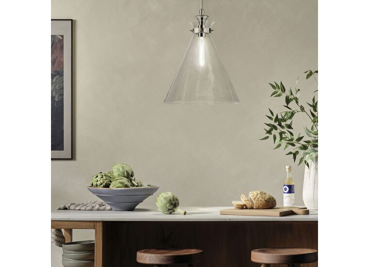 The canopy features a soft, subtle curvature for added detail. Clear glass allows the bulb to show through for a truly refined look.