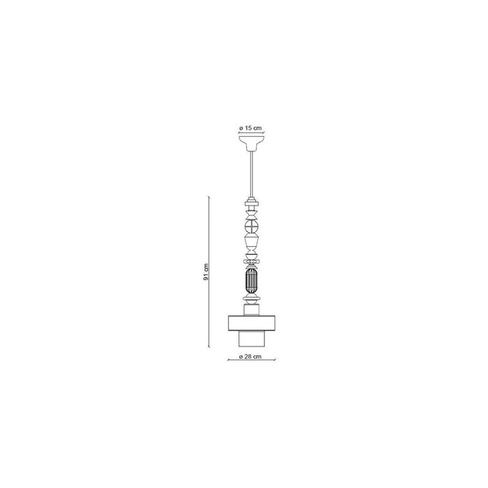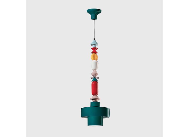 As the chain progresses with alternating geometrics forms, it reaches the ceramic lampshade, either a diamond shape or cylinder-shaped shade.