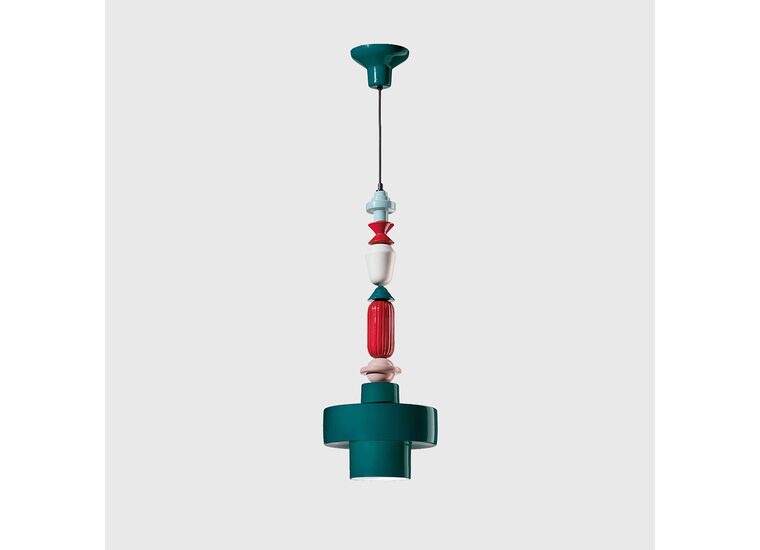 As the chain progresses with alternating geometrics forms, it reaches the ceramic lampshade, either a diamond shape or cylinder-shaped shade.