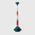 As the chain progresses with alternating geometrics forms, it reaches the ceramic lampshade, either a diamond shape or cylinder-shaped shade.