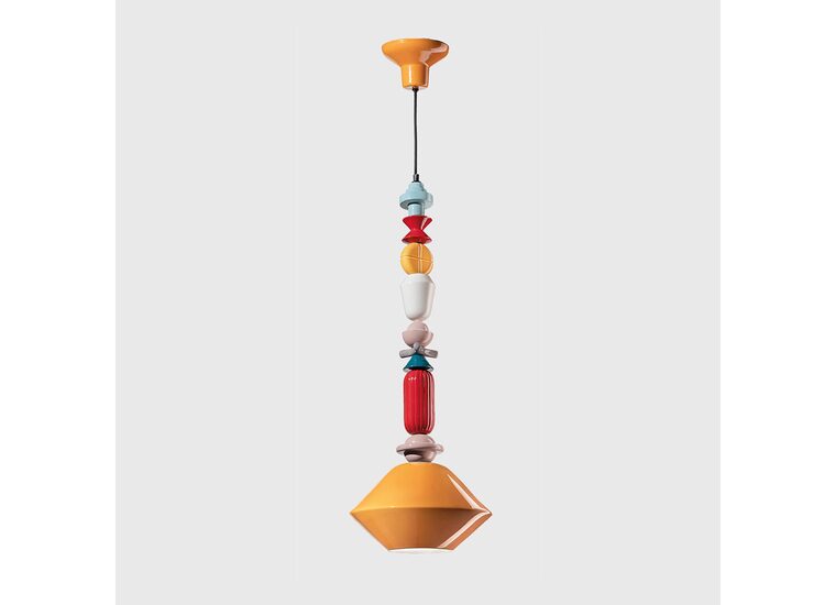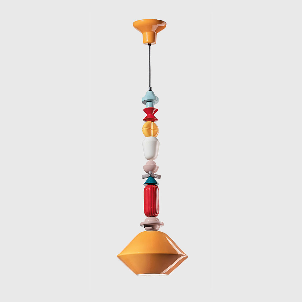 As the chain progresses with alternating geometrics forms, it reaches the ceramic lampshade, either a diamond shape or cylinder-shaped shade.