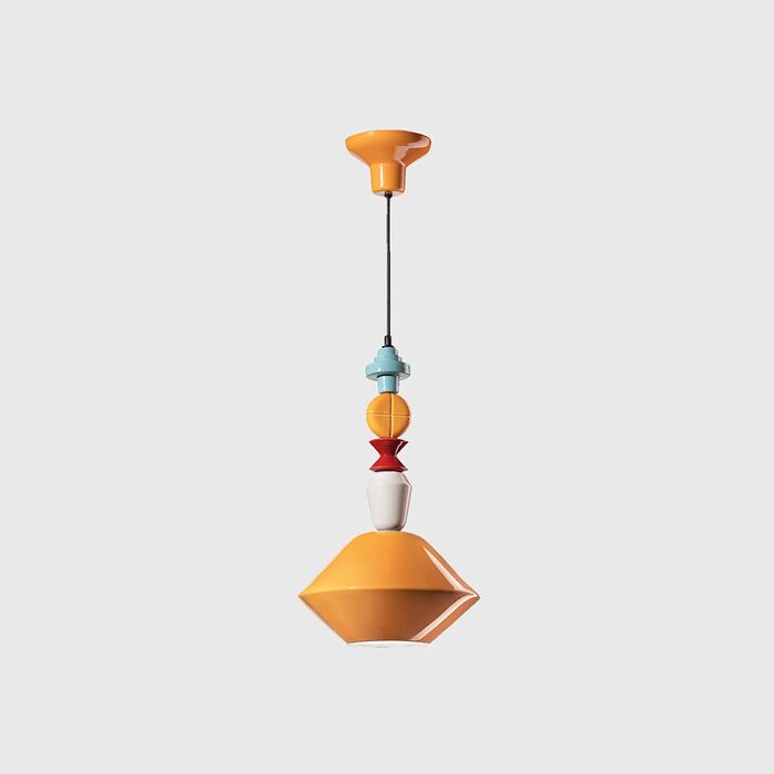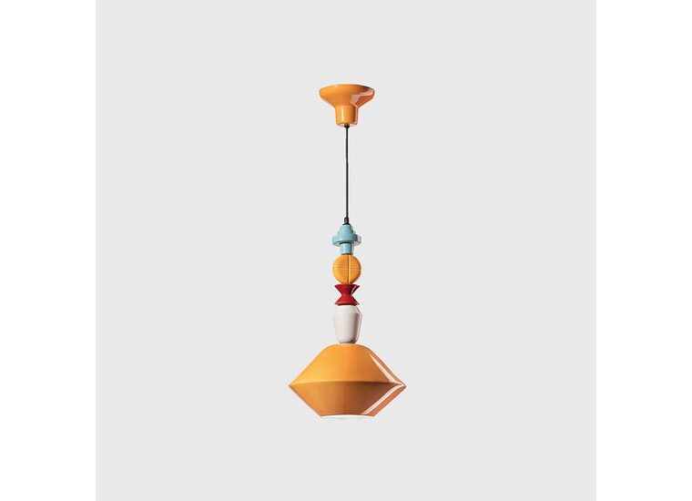 As the chain progresses with alternating geometrics forms, it reaches the ceramic lampshade, either a diamond shape or cylinder-shaped shade.