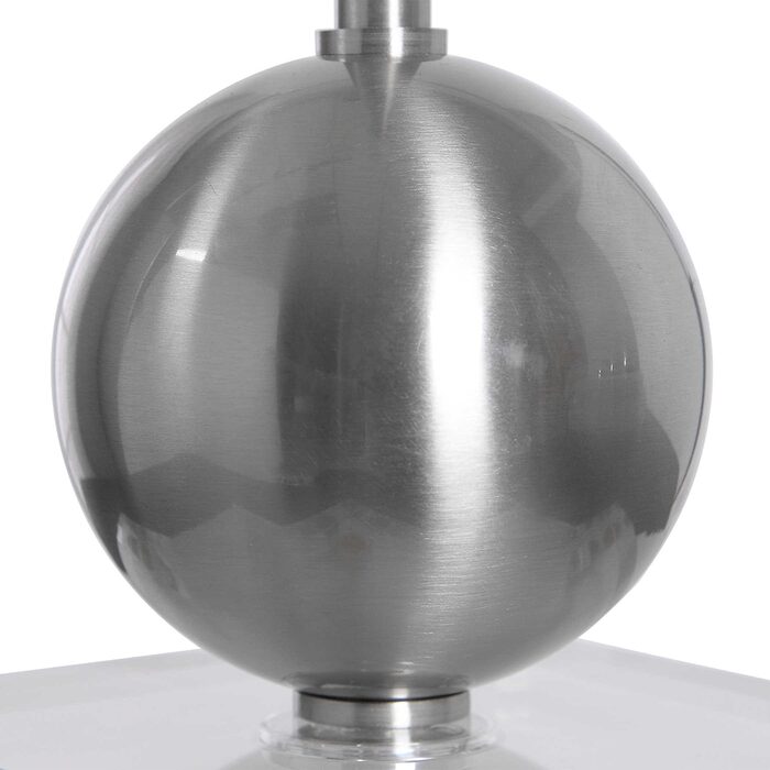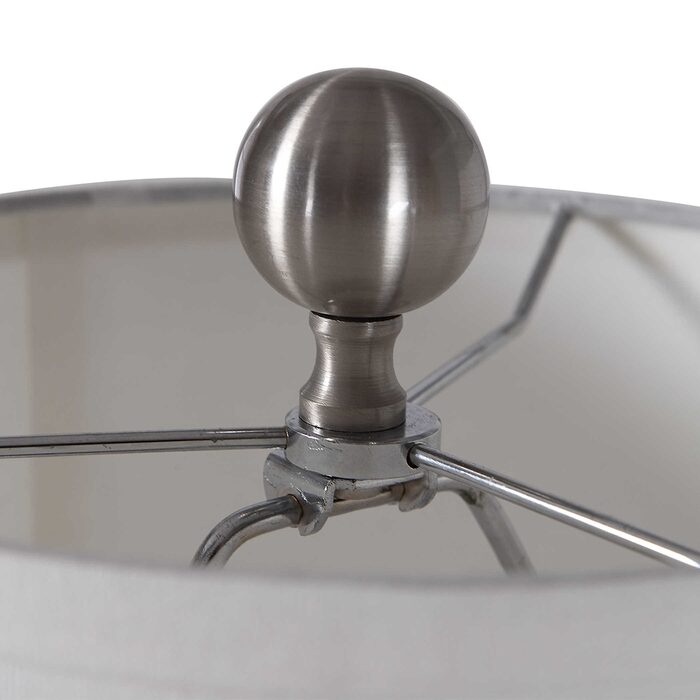 This versatile buffet lamp features smooth iron details finished in a plated brushed nickel, accented with a thick crystal base.