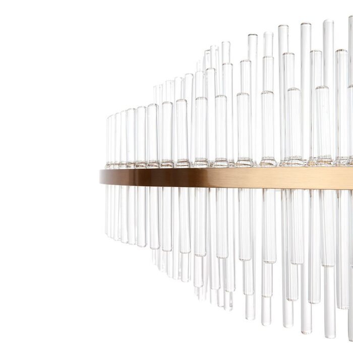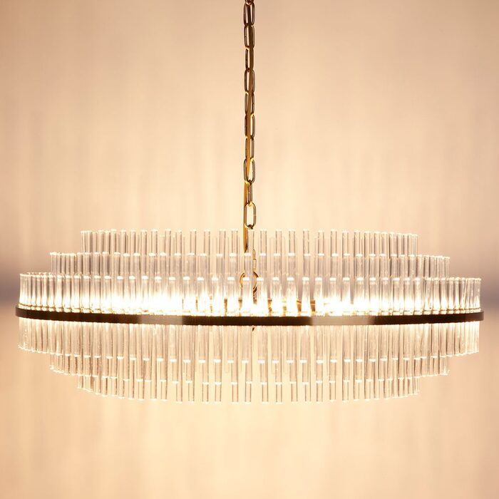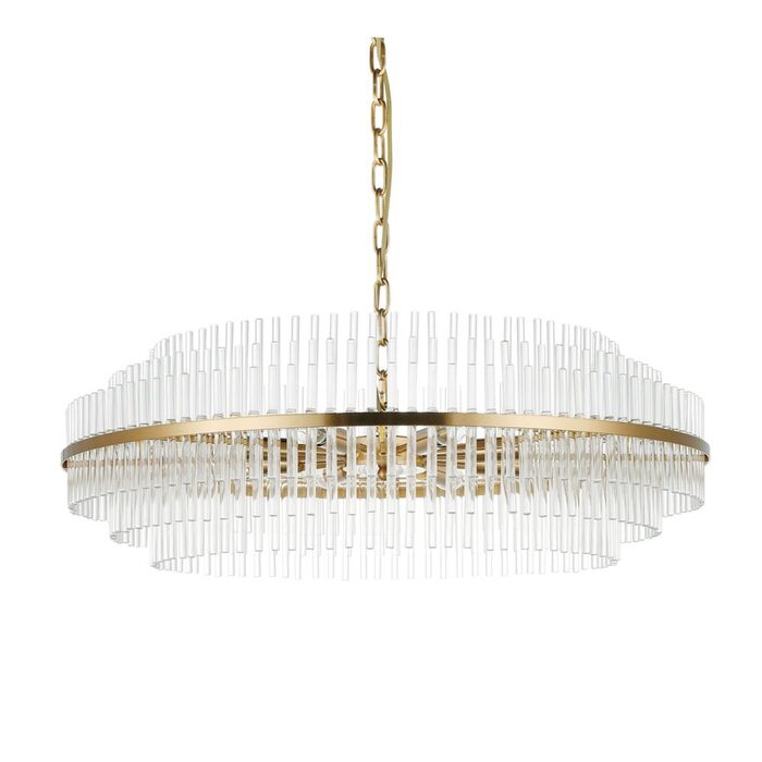 Grand in size and sculptural form, the Lawrence pendant finds a sense of balance between exceptional elegance and extraordinary drama. Crafted with hundreds of clear glass rods delicately dangling from a polished brass frame, the design echoes art deco glamour. The Lawrence pendant commands any living space.