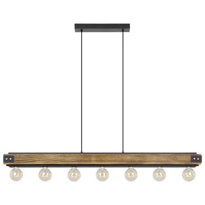 The Layham pendant light is an industrial look that has 5 lamp holders on a timber body suspended from black cords hanging on a matching black rectangular canopy.