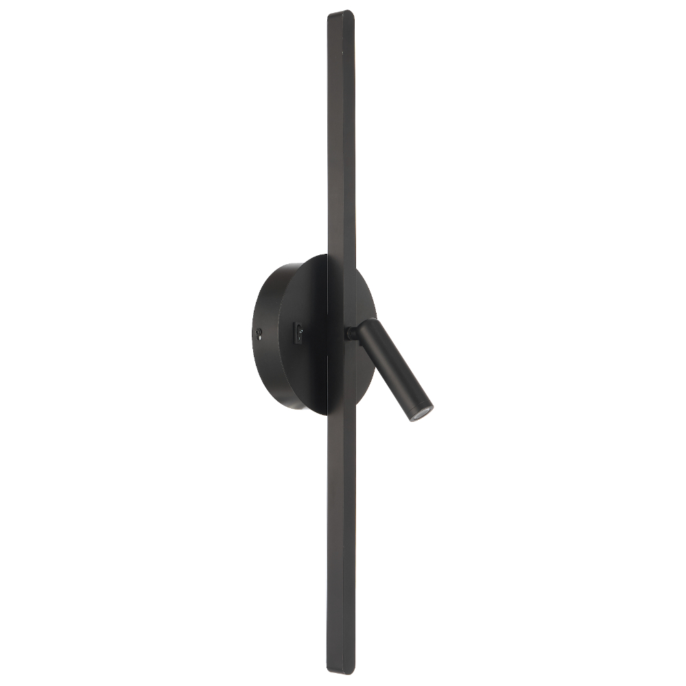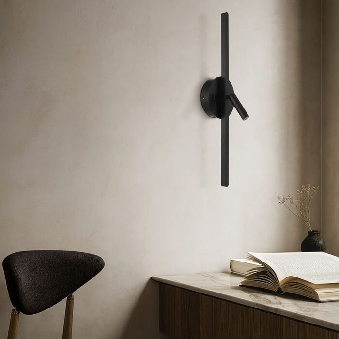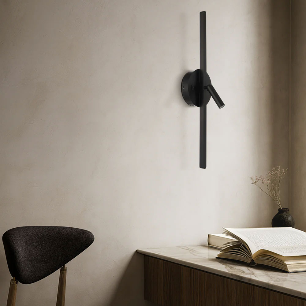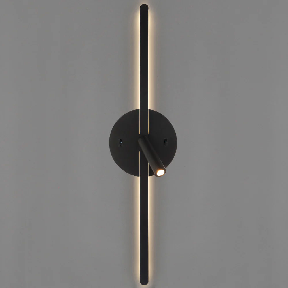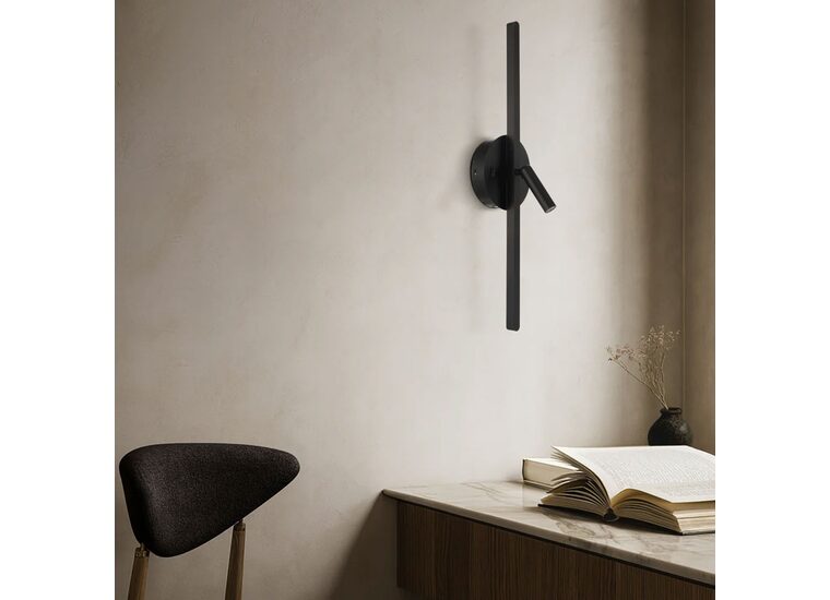 The Lenox wall light is a contemporary design featuring two integrated LED light sources—an adjustable spotlight for focused illumination and a soft backlight emitted from behind the slim linear element.