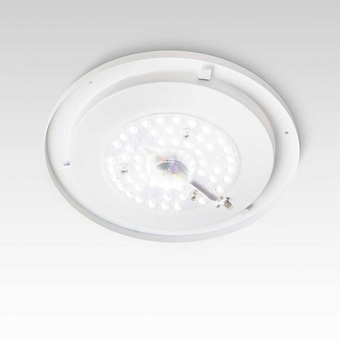 Easily repleaceable integrated led source. Indoor ceiling or wall mounted lamp with integrated LED sources and diffuse light emission.