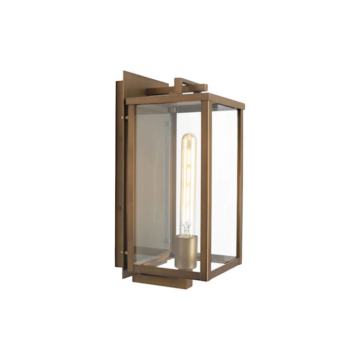 The Lille Exterior Wall Light in Aged Brass & Clear by Cougar Lighting features a timeless design with a clear glass shade for bright, focused illumination.