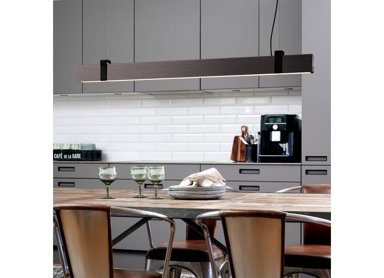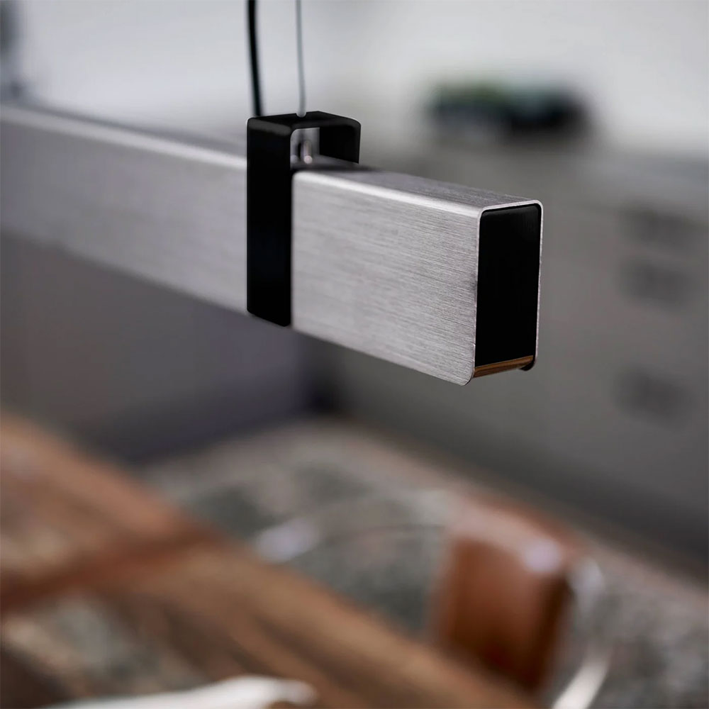 The simplicity of the pendant is emphasized by two beautiful black fittings that contrast the stringent rectangular gun metal surface.