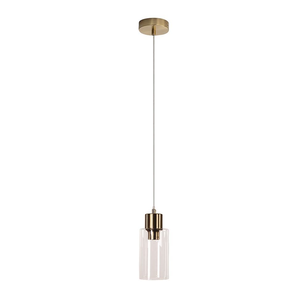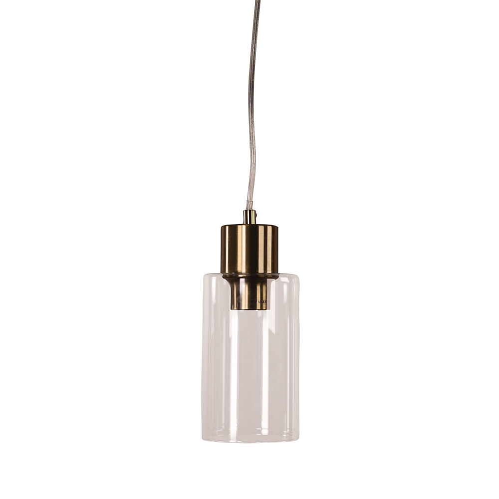 The LISA pendant in satin brass metalware with a clear glass shade.