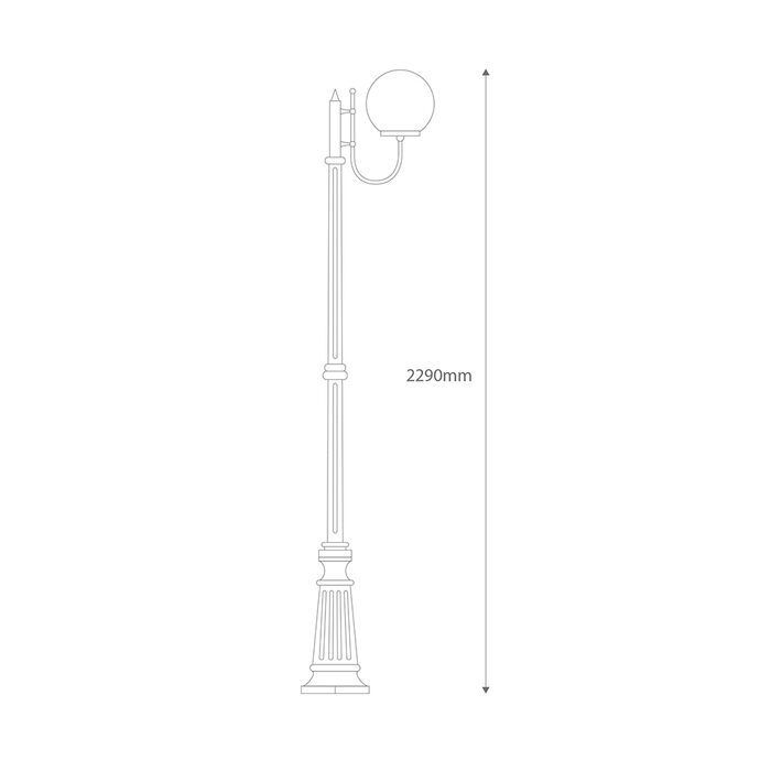 Lisbon 1 light curved arm 2.29m single head post light, die-cast aluminium body complete with 250mm opal acrylic sphere. Made in Italy, assembled and powder coated in Australia.