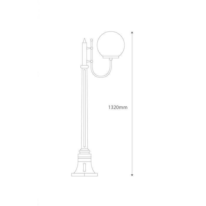 Lisbon 1 light curved arm 1.32m post light, die-cast aluminium body complete with 300mm opal acrylic sphere. Made in Italy, assembled and powder coated in Australia.