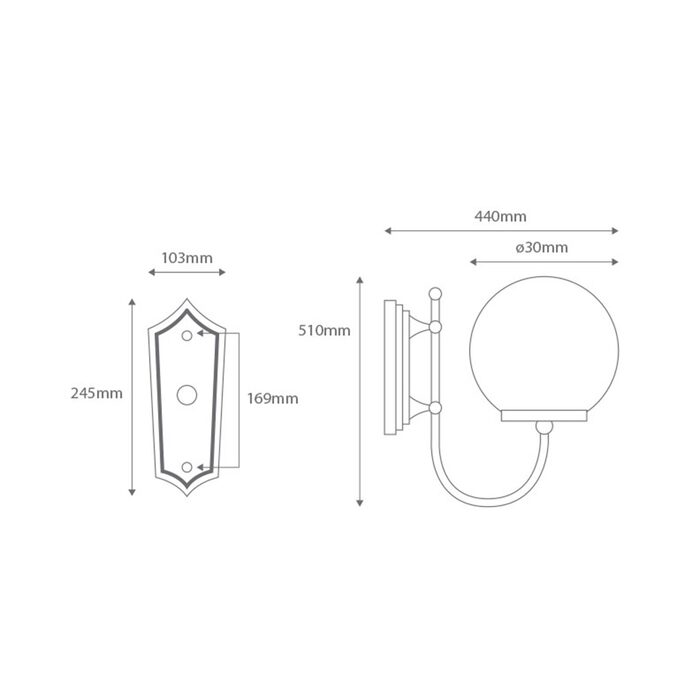 Lisbon 1 light curved arm wall bracket, die-cast aluminium body complete with 300mm opal acrylic sphere. Made in Italy, assembled and powder coated in Australia.Can be mounted facing up or down.